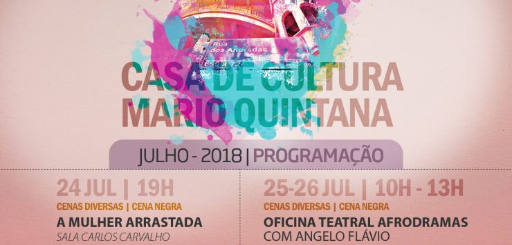 O projeto “Cenas Diversas” marca a abertura do Plano Anual de Atividades 2018-2019 da Casa de Cultura Mario Quintana. Nesta edição, o tema será “Cena Negra”, que vai abordar importantes questões de diversidade e estética afro-brasileira. Entre os dias 24 e 26 de julho, serão apresentados os espetáculos “A Mulher Arrastada”, “Qual a diferença entre o charme e o funk?” de Porto Alegre e “En(cruz)ilhada”, de Salvador (BA), todos com entrada gratuita. Também será realizado o workshop “AfroDRAMAS: Um passeio teórico e prático através do Teatro Negro no Brasil”, com o diretor, ator e ativista baiano, Ângelo Flávio. O Plano Anual tem incentivo da Lei Rouanet, patrocínio do Banrisul, gestão e planejamento da Cida Cultural e realização da Casa de Cultura Mario Quintana, Associação dos Amigos da Casa de Cultura Mario Quintana e do Ministério da Cultura/Governo Federal.
